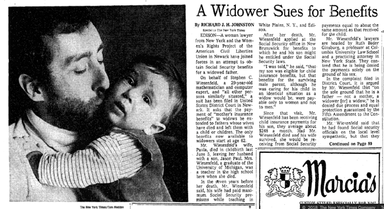 Ginsburg represented widower Stephen Wiesenfeld in challenging a Social Security Act provision that provided parental benefits only to widows with minor children.